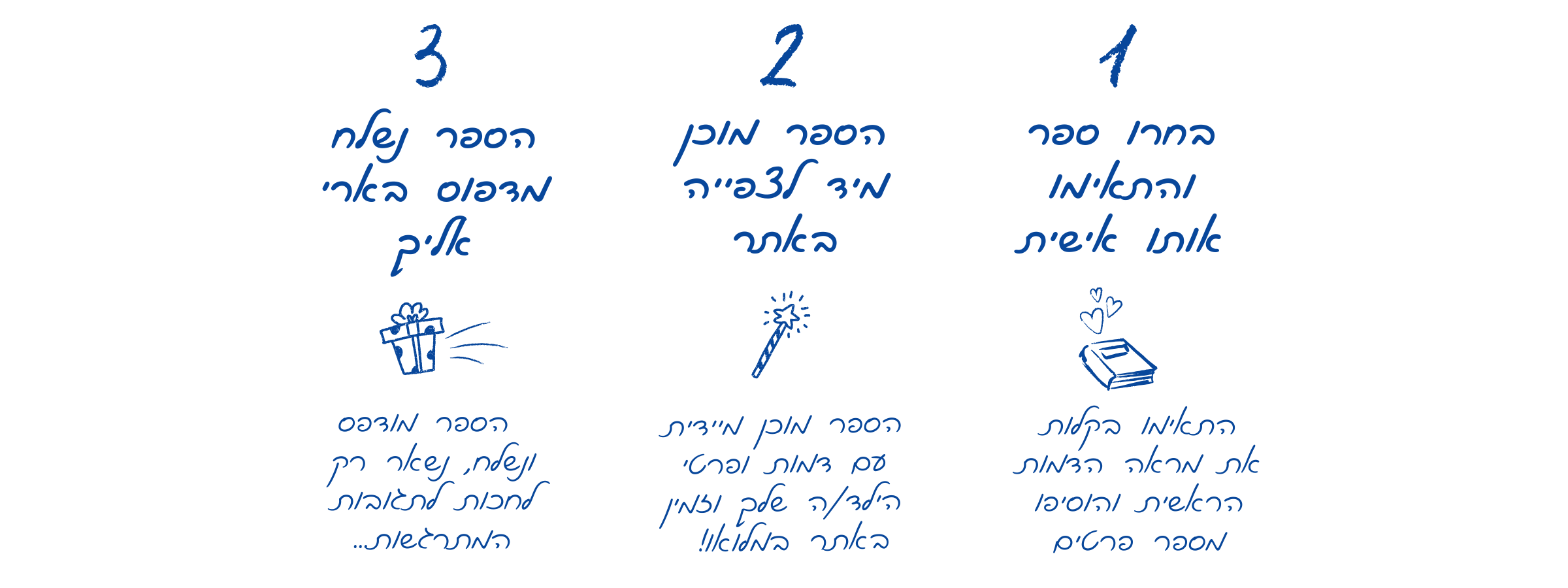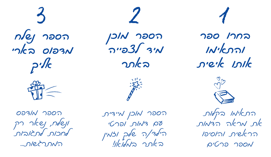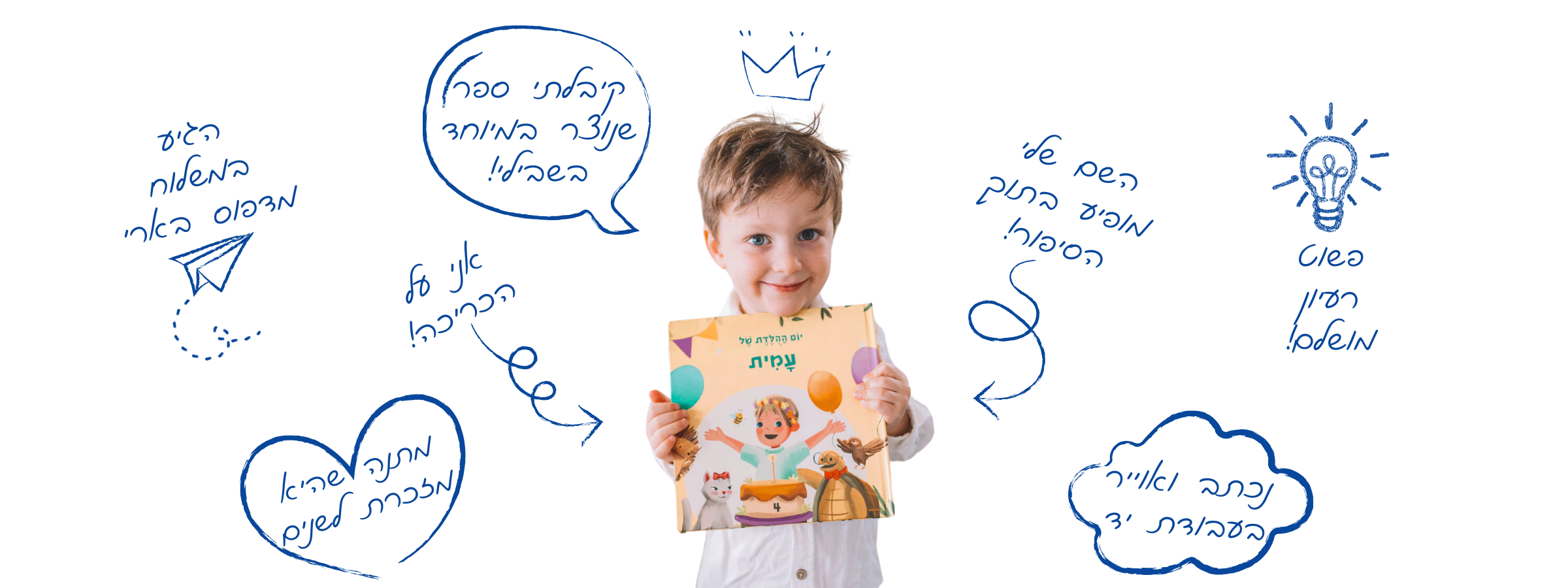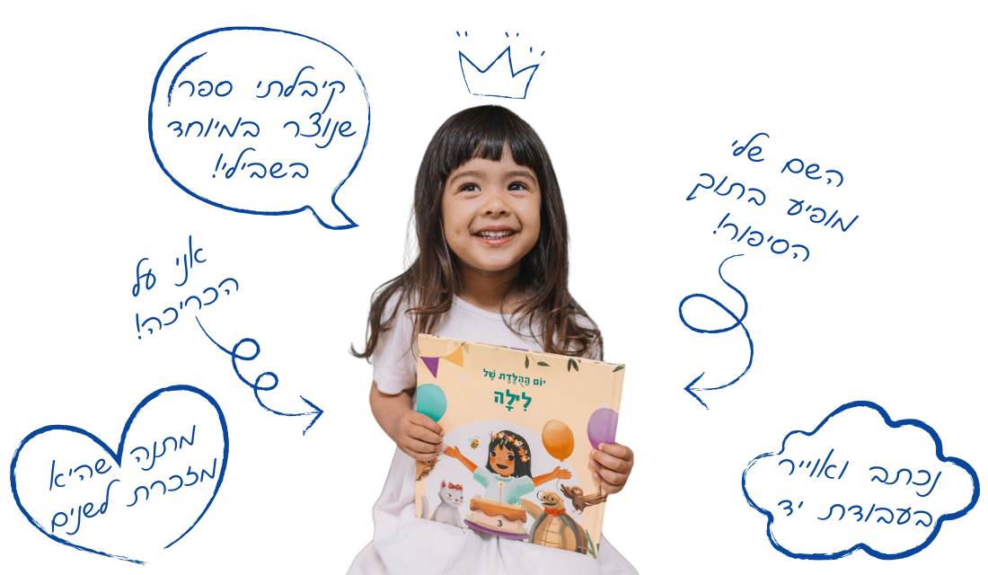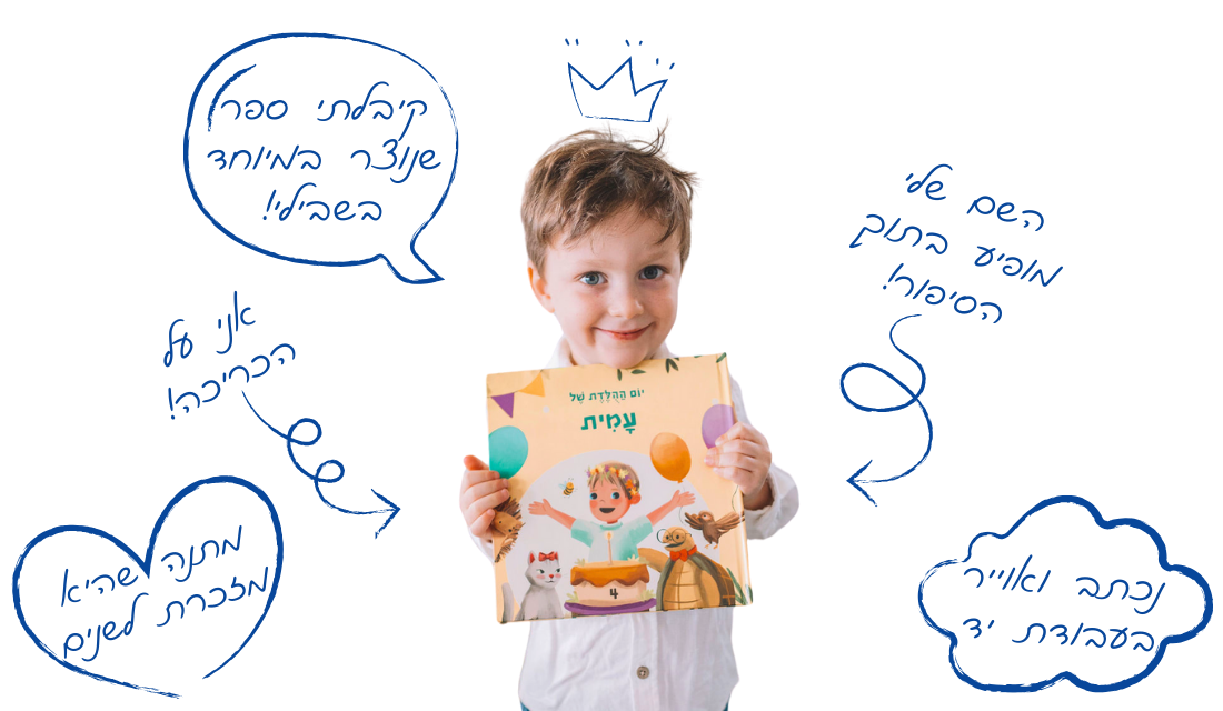 הדמות, השם והפרטים של הילד/ה ממש בתוך הסיפור. איורים בעבודת יד, ללא בינה מלאכותית, ואפשר לצפות בספרים במלואם באתר!